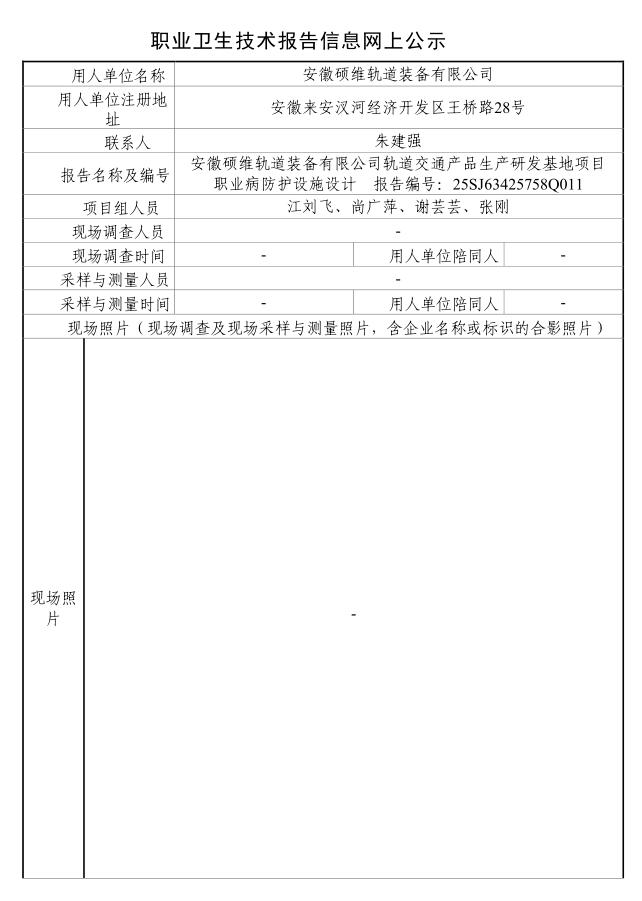 安徽碩維軌道裝備有限公司軌道交通產品生產研發基地項目 職業病危害預評價報告 報告編號:25YP63425758Q009